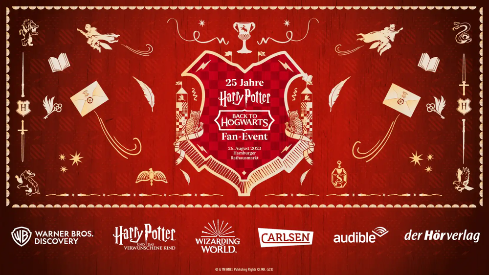 Hamburg wird magisch! Am 26. August findet auf dem Hamburger Rathausmarkt ein großes Harry-Potter-Event statt. Anlass ist das 25-jährige Jubiläum des ersten Harry-Potter-Buches in Deutschland. Der Carlsen Verlag, Warner Bros. Discovery und das Hamburger Showhighlight „Harry Potter und das verwunschene Kind” zusammen mit Audible und dem Hörverlag laden Harry-Potter-Fans zum großen Jubiläums-Event ein!