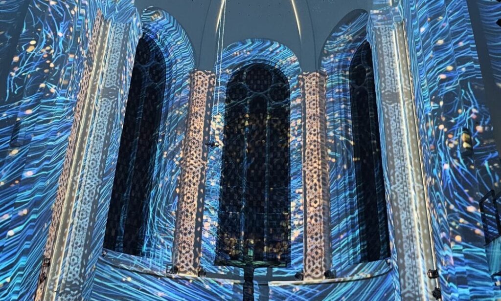 Die Besucherinnen und Besucher sitzen auf den Kirchenbänken der Johanneskirchen oder liegen in Sitzkitzen. Alle warten gespannt auf das, was sie erwartet. Und dann geht es los, die Reise durch die Schöpfungsgeschichte beginnt. Die gesamten Flächen der wunderschönen Johanneskirche werden von Projektoren angestrahlt.