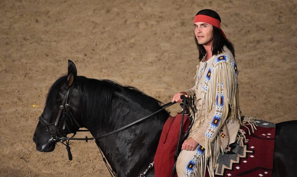 Das glamouröse Schurkenpaar Donna und Charles Leveret (Sonja Kirchberger und Francis Fulton-Smith) hat seine Schusswaffen gezogen. „Man ahnt, dass beide wild entschlossen sind, ihre düsteren Ziele zu erreichen“, sagt Geschäftsführerin Ute Thienel. Über allem thront der legendäre Apachenhäuptling Winnetou (Alexander Klaws), dessen Blick in die Ferne schweift. Ute Thienel: „Diese ganz besondere Aura, die Alexander Klaws in die Rolle einbringt, kommt wunderbar rüber. Sein Winnetou ist zugleich kämpferisch, emotional und ein Häuptling voller Sehnsucht nach Frieden.“