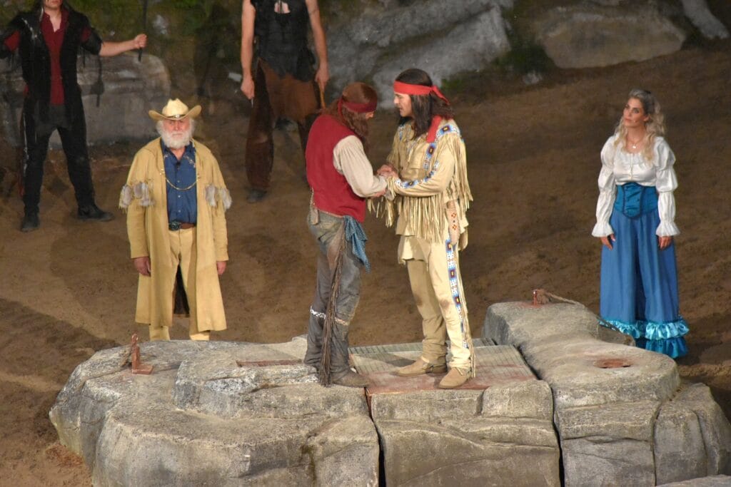 Glänzen tut natürlich auch wieder Alexander Klaws als Winnetou, der in diesem Jahr wieder auf Old Shatterhand trifft. Passend dazu kehrt auch Bastian Semm zurück. Das Wiedersehen der Figuren ist bewegend und toll in Szene gesetzt. Die Zuschauer erleben 2025 dabei einen Winnetou, der gerade jetzt, in diesen schwierigen Zeiten in dieser der Welt, mehr denn je gebraucht wird. „Manche Menschen bringen nur Hass in diese Welt“, macht Winnetou klar und unterstreicht: „Das Gute und das Böse gibt es in jeder Hautfarbe.“