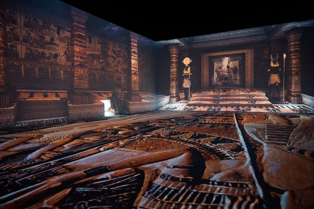 Durch modernste 360°-Technologie erleben Besucher die Mythologie des alten Ägypten und folgen dem König über die Grenzen des Lebens hinaus, erleben seine Reise ins Leben nach dem Tod und werden Zeuge seiner Verwandlung vom sterblichen Herrscher zum ewigen Sonnengott.